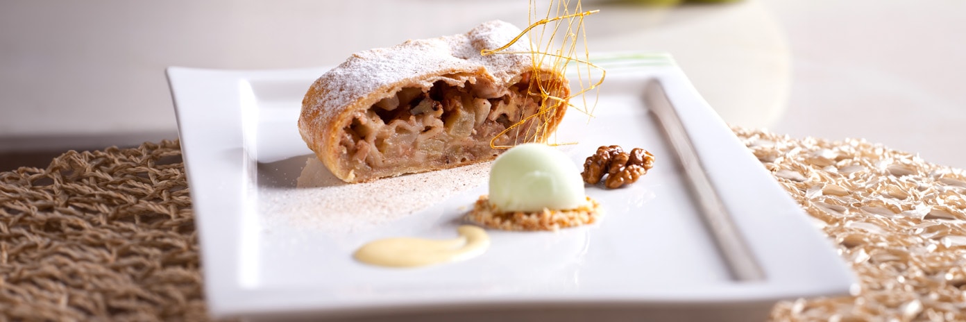 Jablečný závin z taženého těsta se sorbetem a ořechy