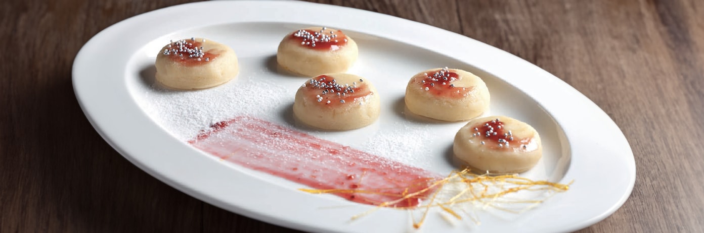 Jednotlivé díly těsta vyválíme na plát o výšce 3 mm. Při vyvalování těsto průběžně podsypáváme hladkou moukou, při otočení přebytečnou mouku z těsta odstraníme štětcem nebo smetáčkem na mouku. Vypichovací tvořítko o průměr 2,5 cm nejdříve vložíme do misky s moukou, poté vypíchneme kolečko z těsta a přemístíme je na plech s pečícím papírem. Pečeme v předehřáté troubě při 160 °C do světle narůžovělé barvy asi 8 minut.