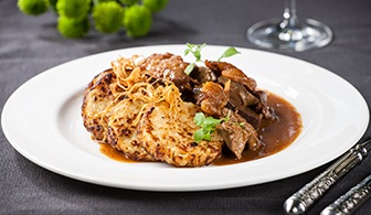 Pečená kachna s kysaným zelím s medem a jablky, kroupovými lívanečky a omáčkou demi glace
