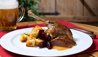 Pečené kachní stehno s bramborové knedlíky, červené bavorské zelí