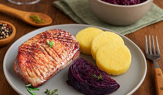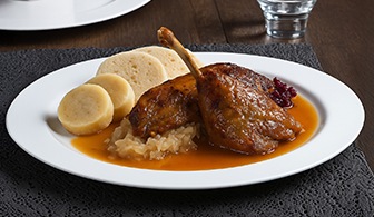 Kachní stehno na kmíně s bramborovými knedlíky, bílým a červeným zelím