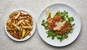 Kuřecí stehenní řízek s gratinovaným bramborem a rajčatovým salátem