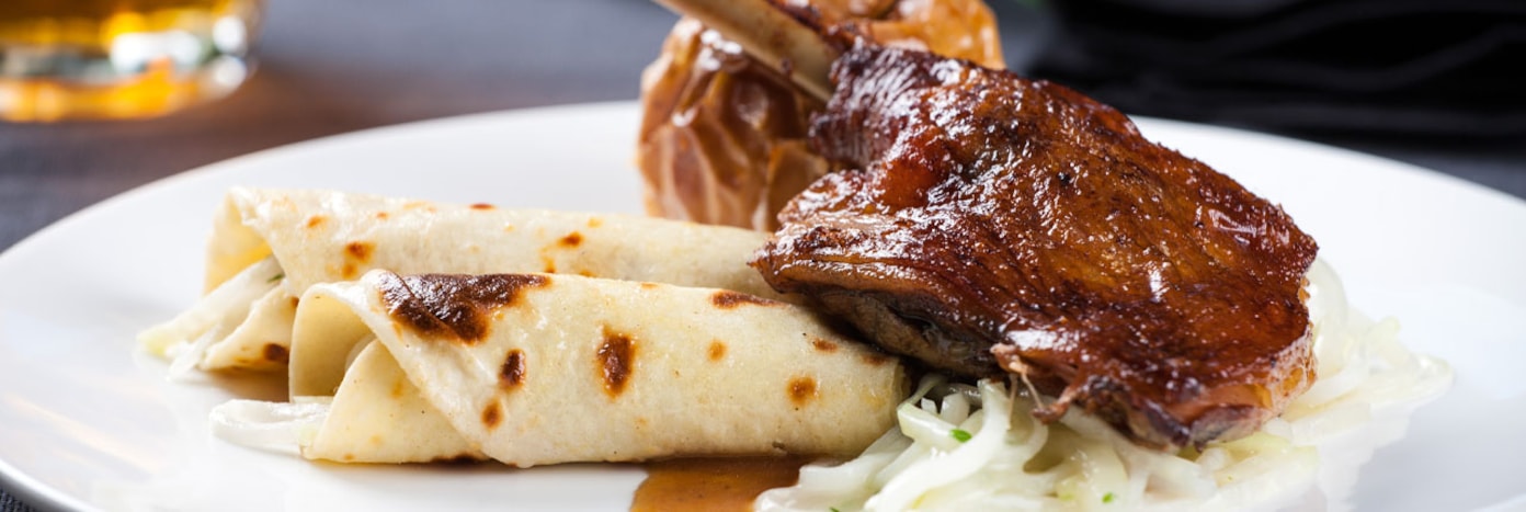 Konfitovaná husí stehna s bramborovými lokši, pečeným jablkem a kedlubnovým zelím