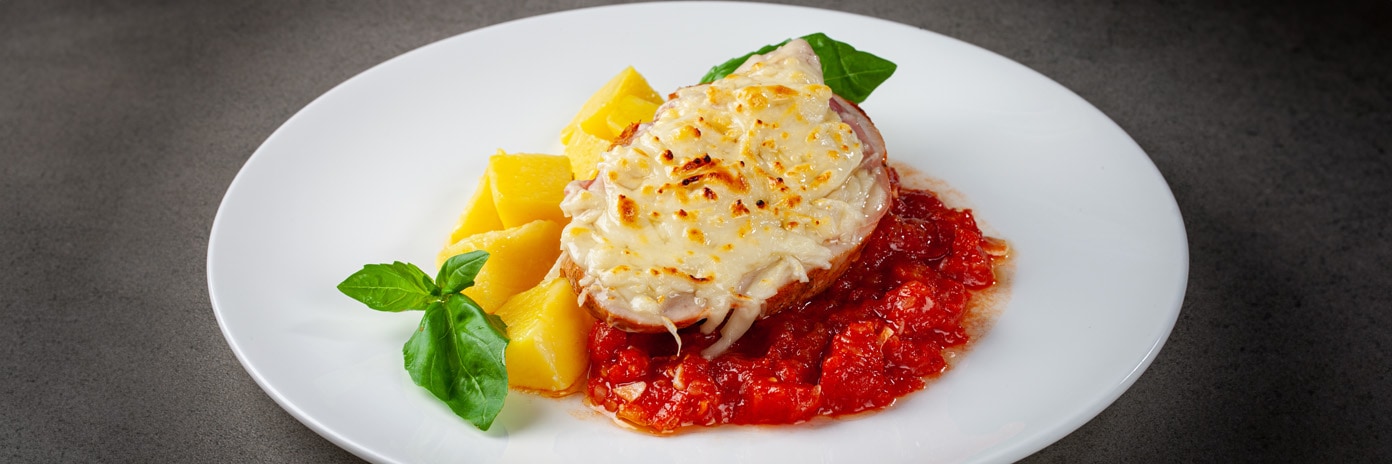 Krůtí prsa vyjmeme z obalu, nakrájíme na porce o hmotnosti 125 g plátky. Nakrájené plátky masa regenerujeme na pánvi tak, aby se důkladně prohřály. Poté na ohřáté plátky masa poklademe plátky šunky a zasypeme strouhaným sýrem. Takto připravené maso zapékáme pod grilem. Sýr se rozpustí a zezlátne.