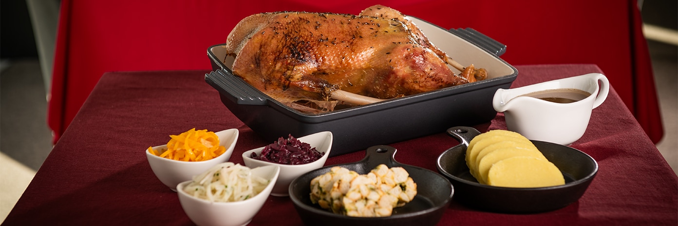 Pečená husa, kedlubnové, dýňové a červené zelí, karlovarské a bramborové knedlíky