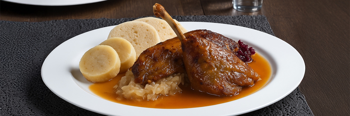 Pečená kachna s houskovými a bramborovými knedlíky, doplněná bílým a červeným zelím