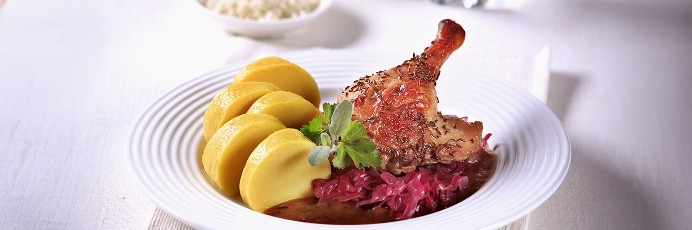Pečené kachní stehno s bramborové knedlíky, červené bavorské zelí