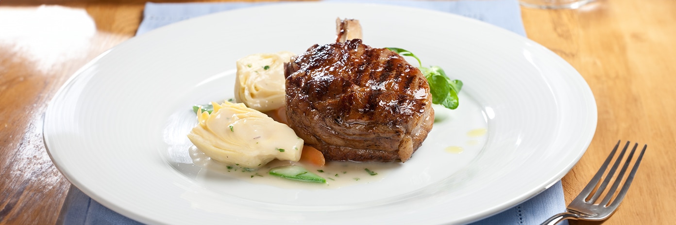 Grilovaná telecí kotleta se zadělávanými artyčoky a mladou zeleninou