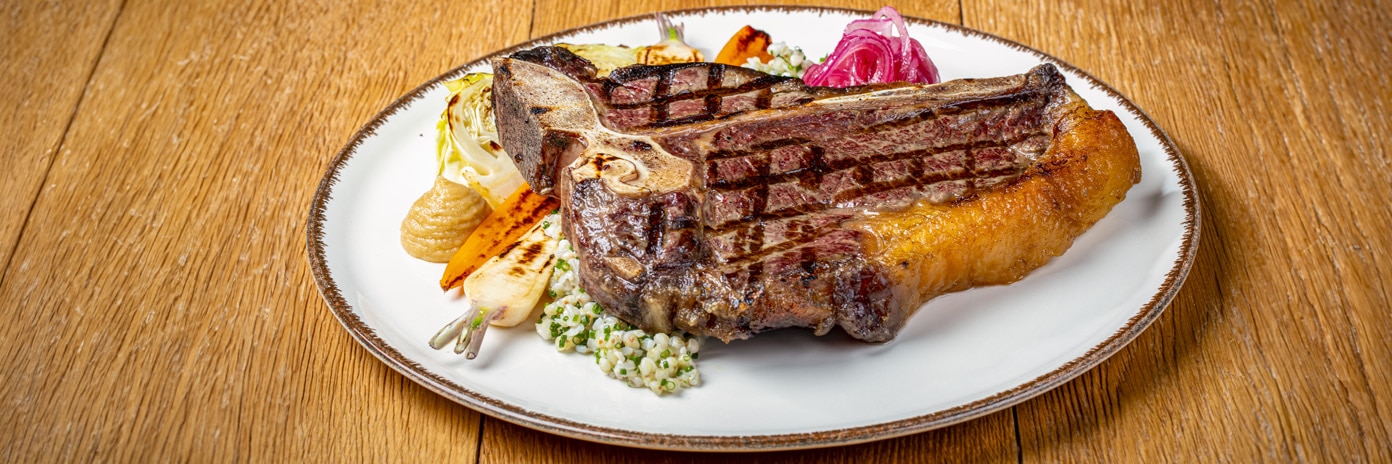 Na levou část dobře nahřátého talíře aranžujeme grilovanou, ochucenou zeleninu s bylinkovou pohankou a česnekovou pěnu. Na pravou stranu talíře poté přeložíme steak.