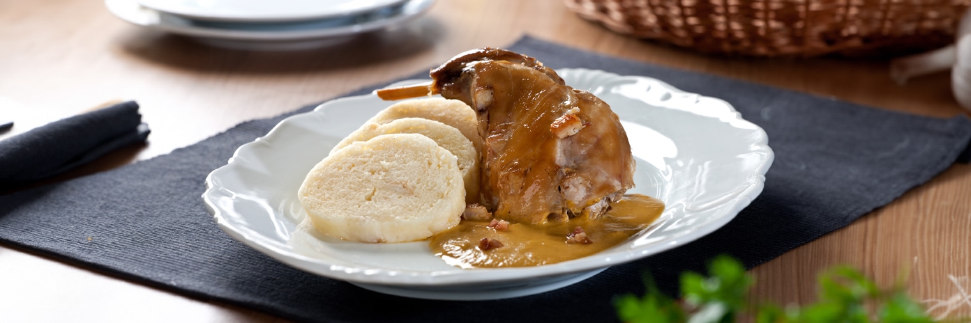 Pečený králík na smetaně s houskovým knedlíkem