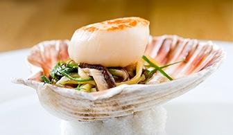 Grilovaná mušle sv. Jakuba s čínským nudlovým sálátem