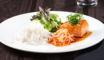 Losos teriyaki, mrkev, ředkev, salát, rýže