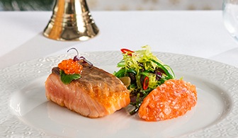 Pečený steak z lososa s tartarem, salátkem a asijským dresinkem