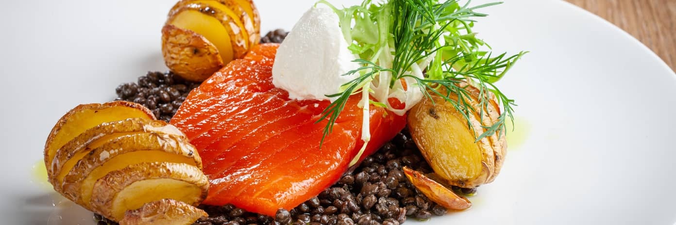 Zauzený lososovitý pstruh s pečenými grenailemi, čočkou belugou a zakysanou smetanou
