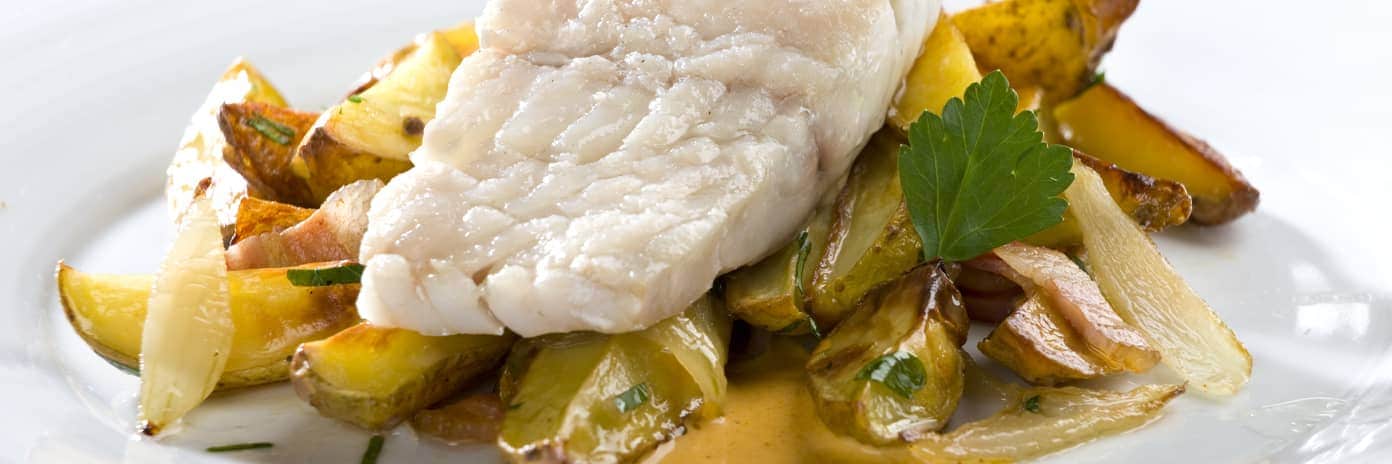 Filet z tresky vařený v páře, pečený brambor, čekankou a bazalkovým olejem