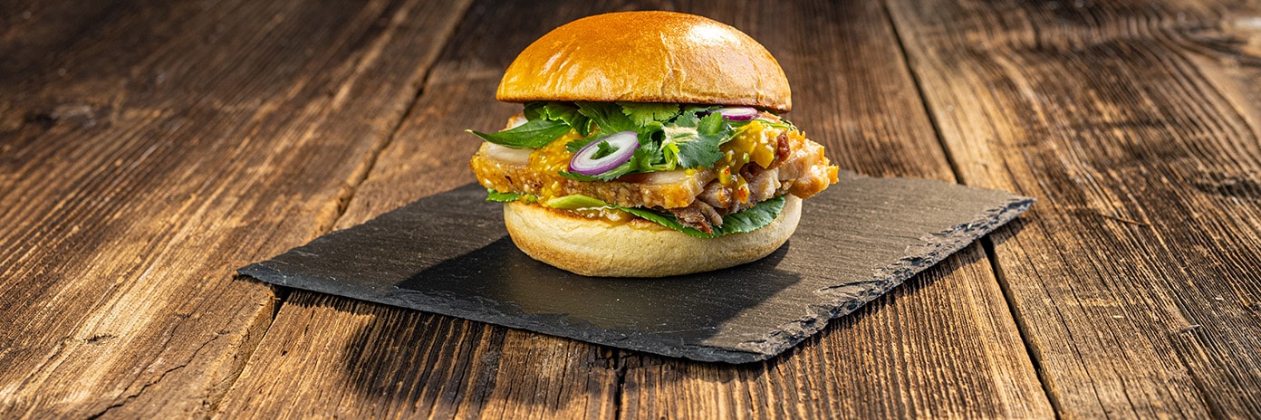 Hamburgerovou housku prokrojíme na poloviny, položíme ji prokrojenými stranami na gril či pánev a opečeme je do zabarvení. Následně opečenou plochu spodního dílu bulky potřeme dresinkem a poskládáme zelenou částí pak choi. Na něj přeložíme opečené maso. Na vrchní maso servírujeme připravený salát. Přiklopíme vrchním dílem, jehož plochu potřeme opět dresinkem.
