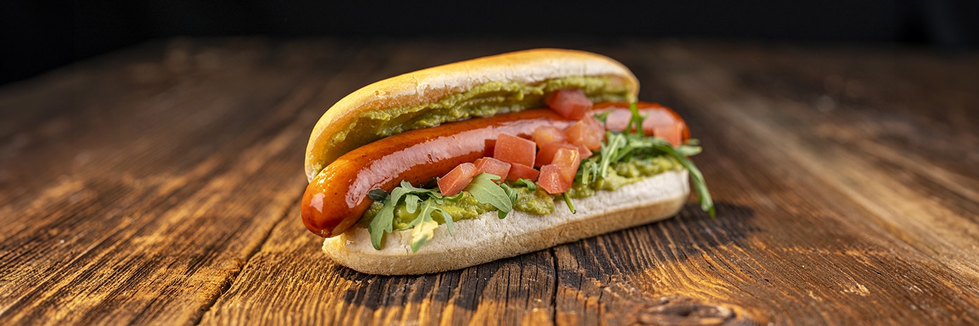 Na pánvi či grilu opečeme párek. Obě strany žemle pečlivě potřeme avokádovou dužninou, poté přidáme rukolu, přeložíme opečený párek a doplníme kostičky rajčat.