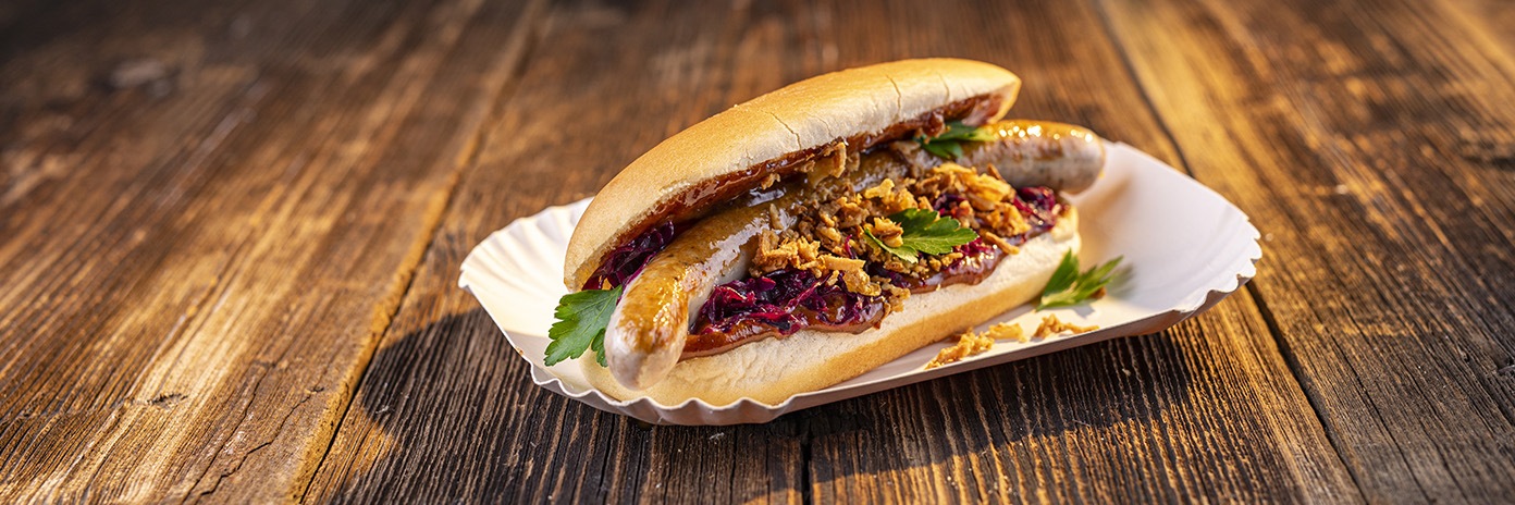 Na pánvi nebo grilu opečeme klobásu. Žemli potřeme po obou stranách omáčkou, na ni rozložíme okapané zelí, přeložíme opečenou klobásu, nakonec posypeme restovanou cibulí a doplníme lístky petržele.