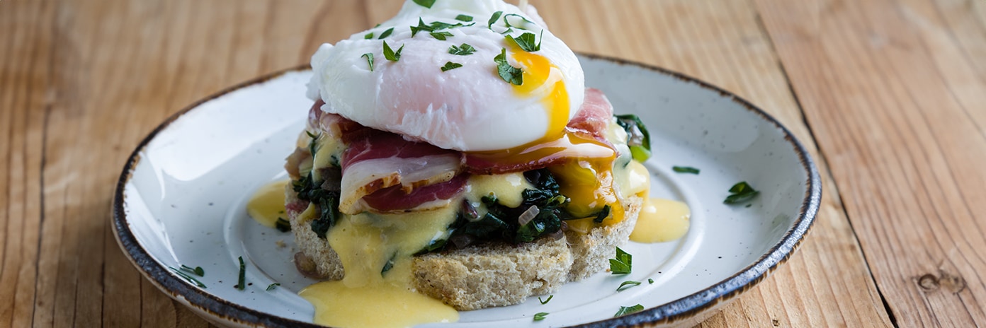 Pošírované vejce s holandskou omáčkou na muffinu se špenátem a slaninou