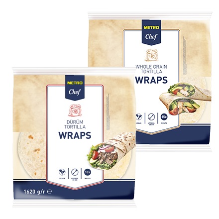 METRO Chef tortily jsou perfektní základ pro wrapy nejen pro street food! Tortilly Durum jsou v tureckém stylu z pšeničné mouky, zatímco Multigrain přináší celozrnnou mouku obohacenou o lněné semínko. Oba druhy jsou 100% vegan a připravené pro profesionální gastro provozy. Skvěle se hodí do fastfoodů, stánků i restaurací – snadná manipulace, spolehlivá kvalita a chuť, která nezklame.